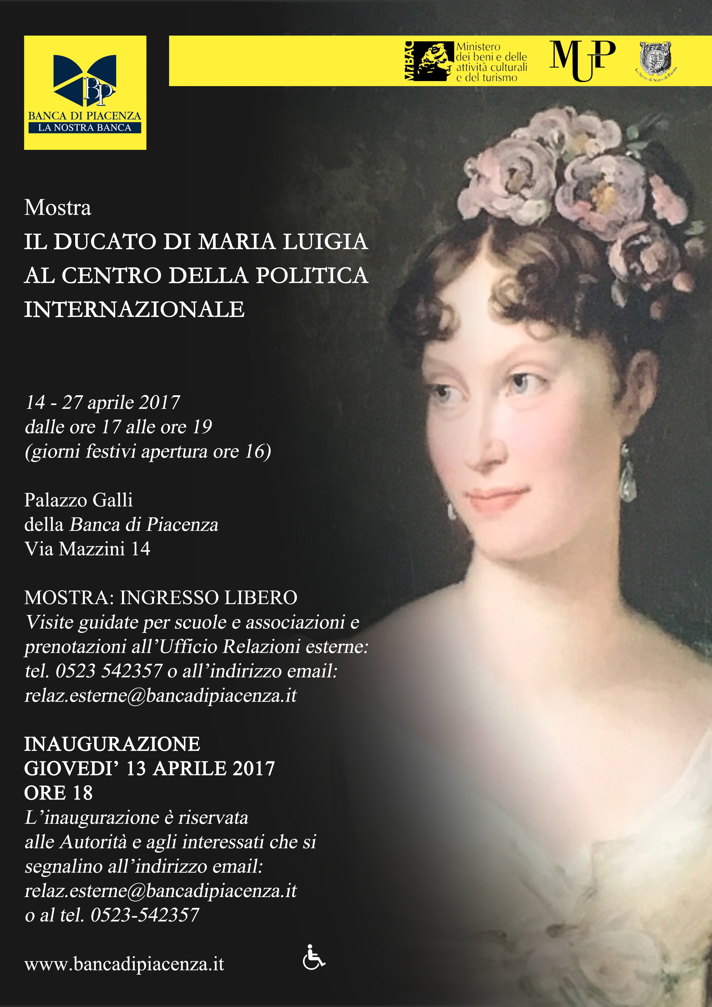 Si è tenuta questa sera a Palazzo Galli l’inaugurazione della mostra “Il Ducato di Maria Luigia al Centro della politica internazionale”, con la partecipazione di un numeroso pubblico interessato ad approfondire la storia di uno dei personaggi più celebri dell’Ottocento piacentino. Tra i presenti l'ambasciatore italiano a Tokyo Giorgi - che si è soffermato in particolare sulle pratiche amministrative del periodo -, il Prefetto Palombi, il col. Moreni del Genio Pontieri, il Direttore dell'Archivio di stato Bulla. A rappresentare la Banca il Presidente del Comitato esecutivo Sforza Fogliani, il Presidente del CdA Nenna, il Direttore generale Crosta, il Condirettore Coppelli, il Vicedirettore generale Boselli ed alcuni Amministratori.