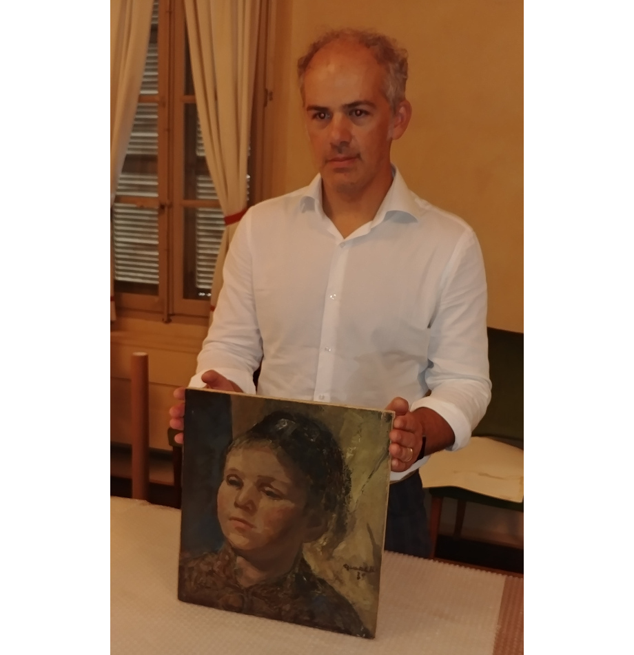 Il frammento “Il balilla” è, com’è noto, collocato in una sala di rappresentanza al primo piano di Palazzo Galli, incastonato in un pannello che presenta, a fianco, la riproduzione in bianco e nero dell’intero quadro di Ricchetti come appariva prima dello smembramento, con evidenziata a colori la posizione in cui si trovava la parte autentica del dipinto. Per consentirne il prestito, è stato necessario dapprima rimuovere il pannello togliendo il vetro protettivo, per procedere poi allo smontaggio del dipinto dal pannello stesso. Operazioni svolte dal restauratore Giuseppe de Paolis (nella foto), che ha sovrinteso anche alle operazioni di imballaggio, a cura di una ditta specializzata nella movimentazione di opere d’arte (Artservice Movers srl, sempre nella foto).