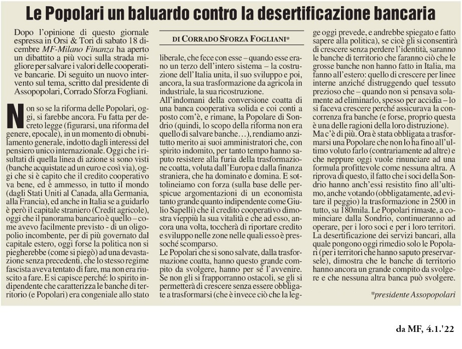 Articolo del Presidente Sforza Fogliani su MF