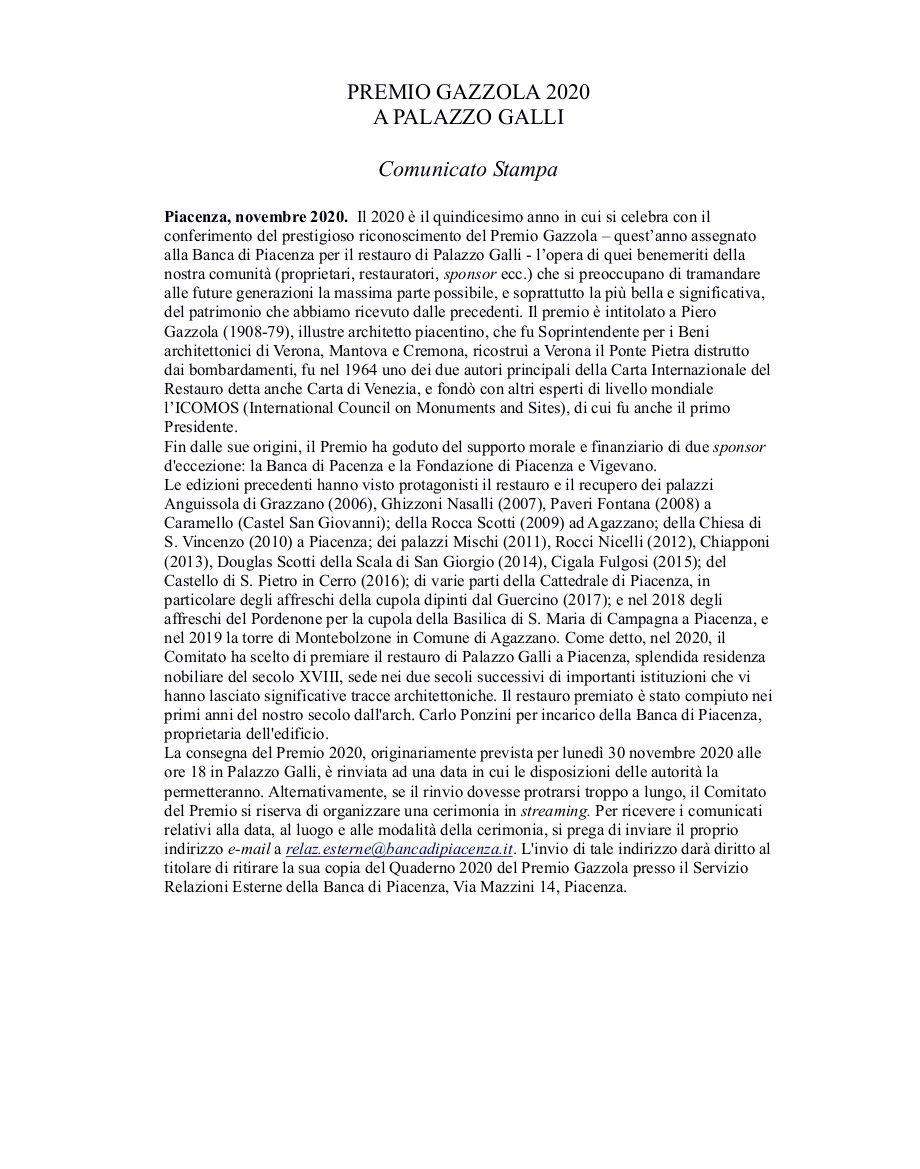 QUADERNO DEL PREMIO GAZZOLA 2020 ASSEGNATO A PALAZZO GALLI