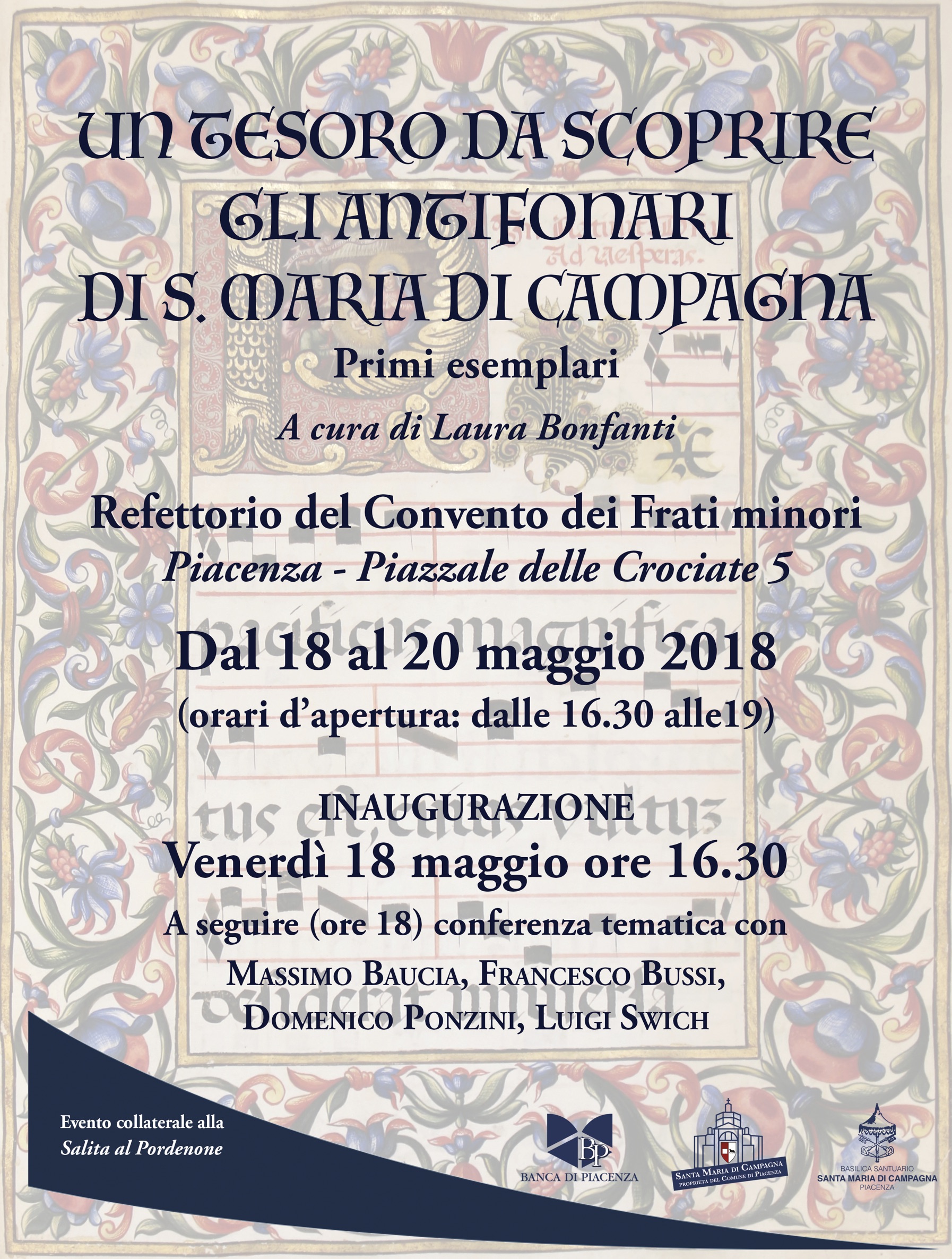L’inaugurazione della mostra “Un tesoro da scoprire. Gli antifonari di S. Maria di Campagna. Primi esemplari” sarà seguita, alle 18, da una conferenza tematica che vedrà alternarsi al tavolo dei relatori il dott. Massimo Baucia, il prof. Francesco Bussi, mons. Domenico Ponzini e il dott. Luigi Swich, coordinati dalla dott. Laura Bonfanti.