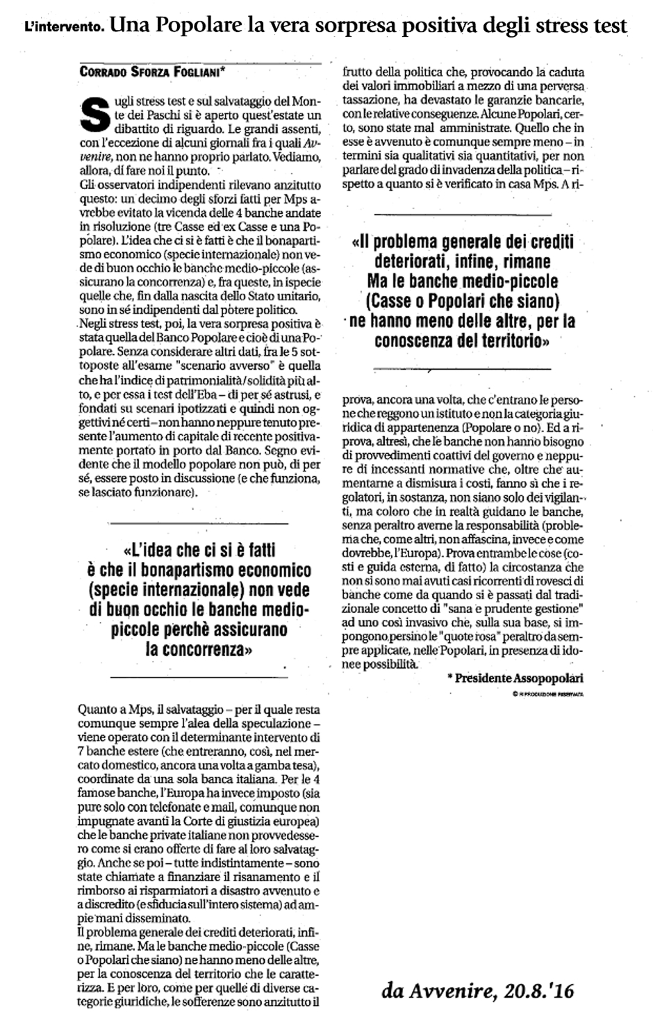Articolo del Presidente Corrado Sforza Fogliani su Avvenire del 20.8.'16