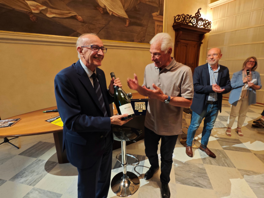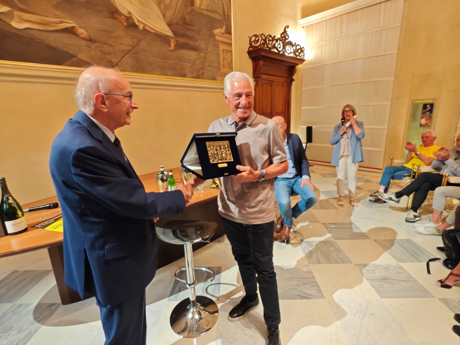 Scambio di doni al termine della stimolante chiacchierata: il presidente della Banca Nenna ha consegnato a Moser la “Targa del Benvegnu” e al giornalista Ceccarelli una pubblicazione di prestigio dell’Istituto dedicata a Palazzo Galli; l’ex campione trentino ha invece omaggiato il presidente della Banca con una bottiglia (autografata) di vino prodotto dalla sua casa vinicola.