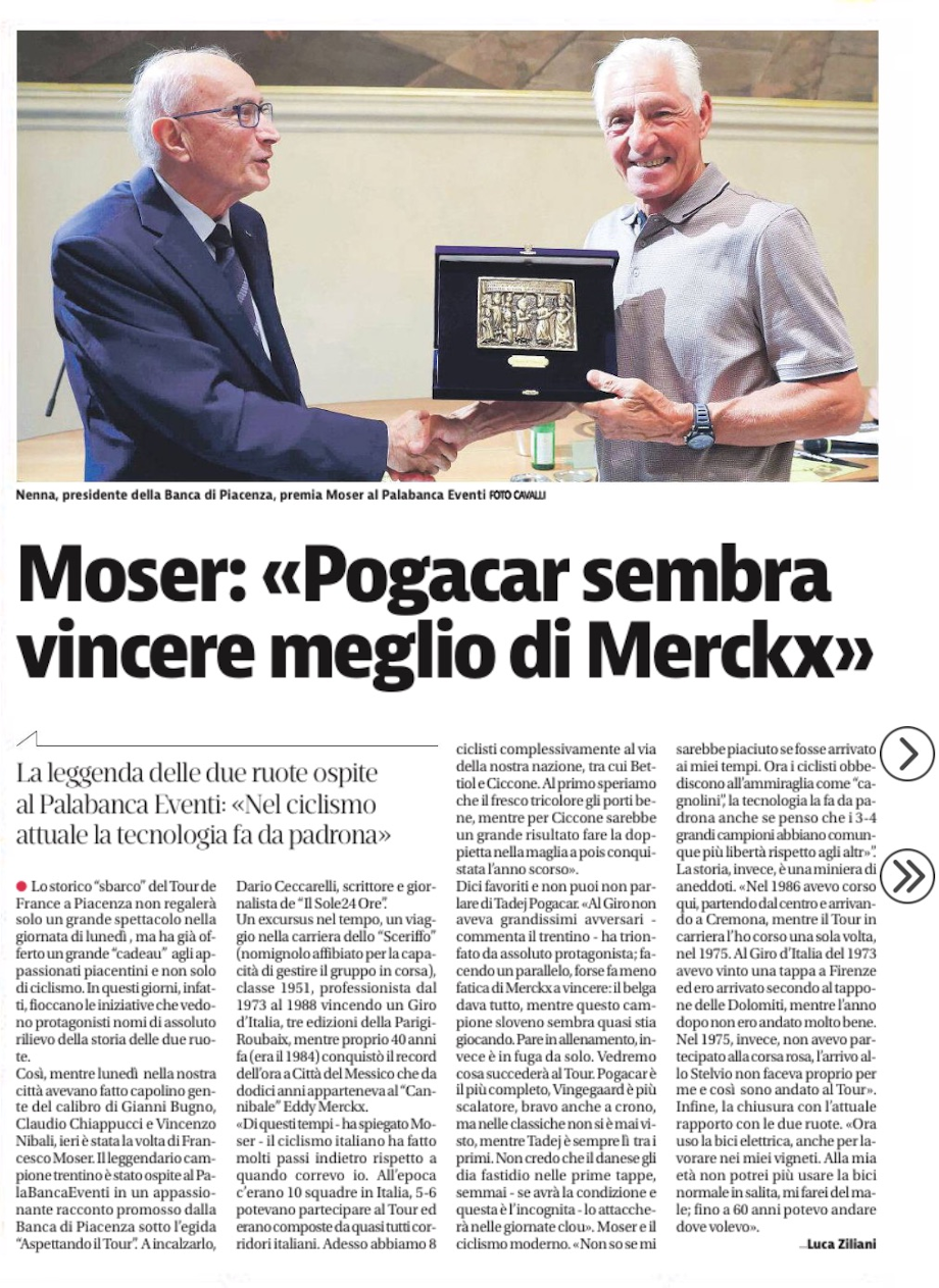 Il grande campione Francesco Moser è stato protagonista prima di un incontro con la stampa, poi di un talk aperto, a ruota libera con Dario Ceccarelli, scrittore e giornalista de IlSole24Ore, dialogando sulle corse, i Giri d’Italia, i record, i campioni, i giovani, i rivali, i chilometri, la passione per la bicicletta, anche il suo nuovo modo di pedalare, nelle vigne e con la gravel e-bike, regalando un personalissimo carismatico spaccato sul grande ciclismo che sta per invadere la città di Piacenza, a poche ore dalla grande partenza del Giro di Francia da Firenze - il 29 giugno 2024 - per la prima volta dall’Italia, e a pochi giorni dalla tappa del primo luglio, dedicata a Fausto Coppi, la Piacenza-Torino, che collega l’Emilia Romagna al Piemonte. Con tutta l’emozione della storia e del presente del grande ciclismo.