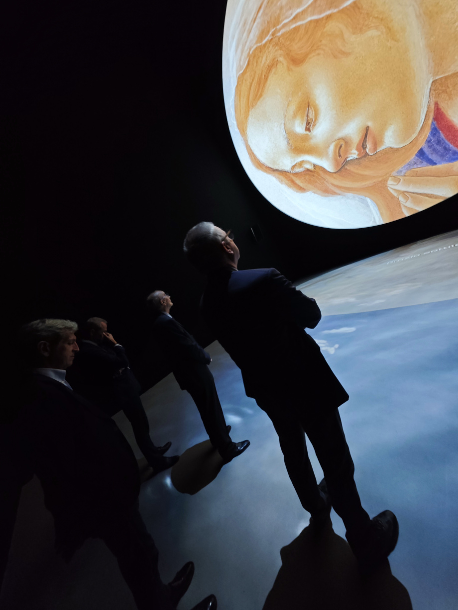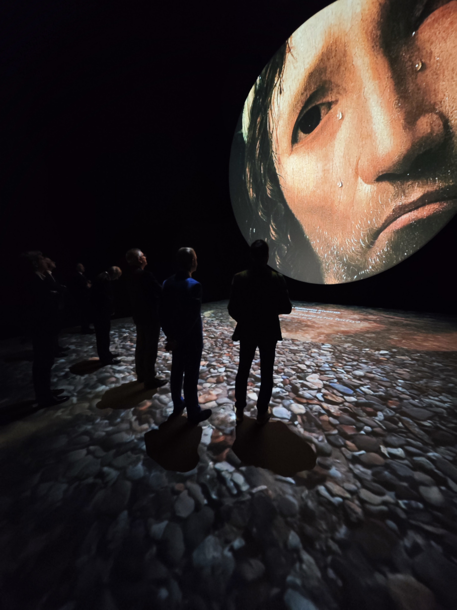 Gli illustri ospiti sono entrati nell’ambiente creato nella Sala Corrado Sforza Fogliani da NEO (Narrative Environments Operas) e caratterizzato da un grande schermo tondo di nove metri di diametro sul quale vengono videoproiettate in sequenza le immagini delle tre opere ingigantite, in lentissimo movimento. La forma tonda è una forma primaria che si staglia nel quadrato della parete. L’intero pavimento è coinvolto da una proiezione di acqua in leggero movimento. Il fondale cambia a seconda del dipinto, alternando atmosfere cromatiche e suggestioni differenti. Alcune parole chiave, o brevi frasi, emergono dall’elemento liquido evocando i messaggi principali di ogni opera: dolore e rassegnazione, umiltà e grazia, fascino e seduzione.