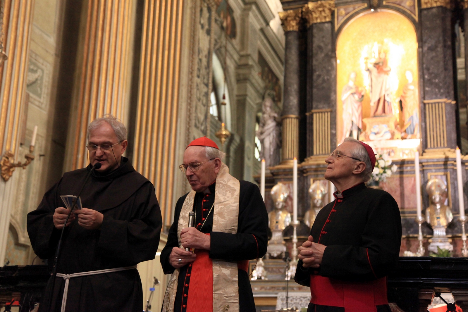 Padre Secondo Ballati, guardiano del Convento di Santa Maria di Campagna, il Cardinale Giovanni Battista Re ed il Vescovo di Piacenza mons. Gianni Ambrosio