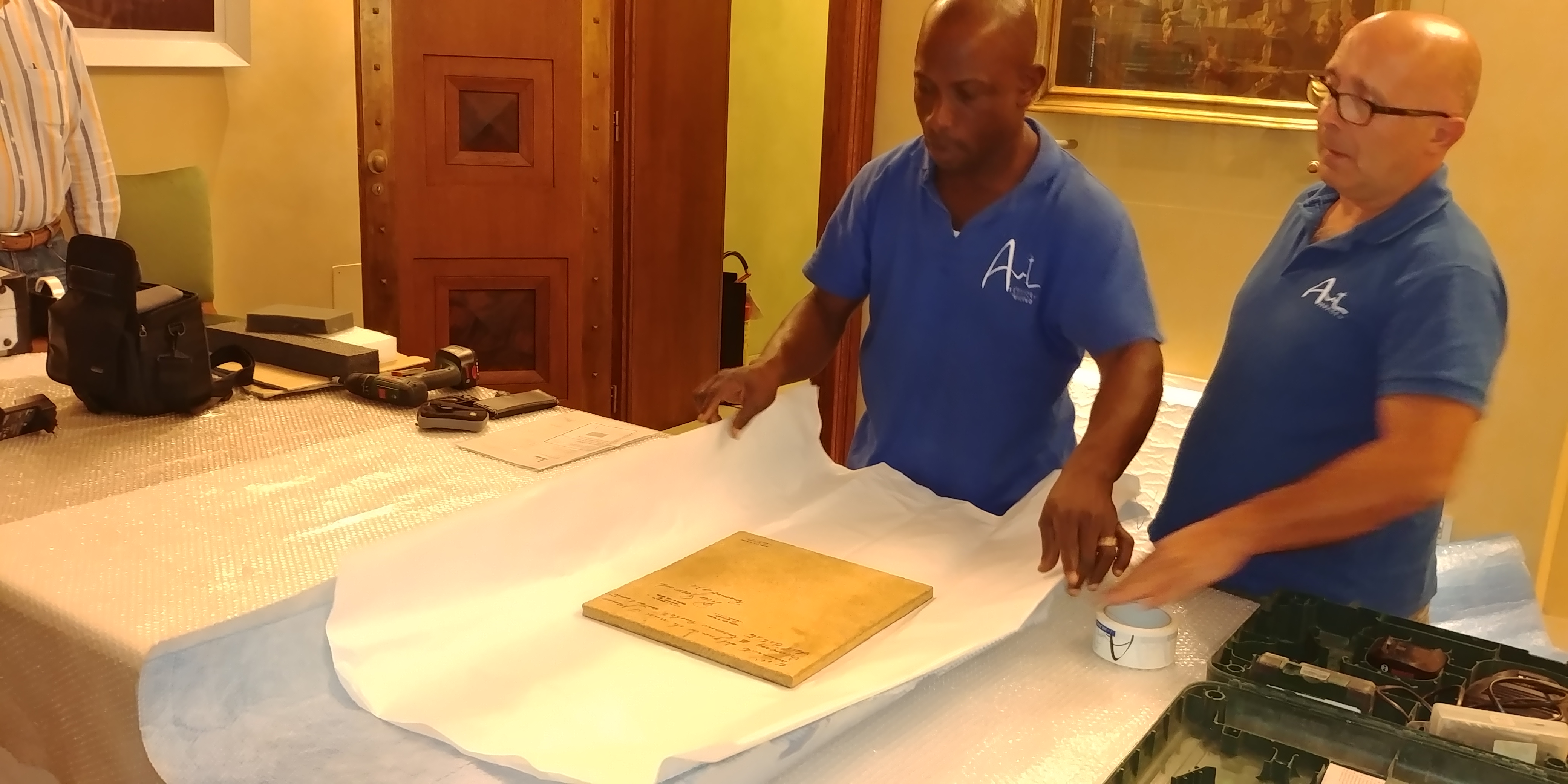 Il frammento “Il balilla” è, com’è noto, collocato in una sala di rappresentanza al primo piano di Palazzo Galli, incastonato in un pannello che presenta, a fianco, la riproduzione in bianco e nero dell’intero quadro di Ricchetti come appariva prima dello smembramento, con evidenziata a colori la posizione in cui si trovava la parte autentica del dipinto. Per consentirne il prestito, è stato necessario dapprima rimuovere il pannello togliendo il vetro protettivo, per procedere poi allo smontaggio del dipinto dal pannello stesso. Operazioni svolte dal restauratore Giuseppe de Paolis (nella foto), che ha sovrinteso anche alle operazioni di imballaggio, a cura di una ditta specializzata nella movimentazione di opere d’arte (Artservice Movers srl, sempre nella foto).